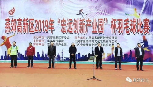 11月23日上午,燕郊高新區2019年“宏遠創新產業園杯”羽毛球比賽在華北科技學院體育館隆重開幕,開幕式由社會發展局副局長王永剛主持,燕郊高新區管委會副主任魏向輝、社會發展局局長李立峰,華北科技學院黨委常委、副校長鄒光華、體育部主任張曉軍,北京市海淀區羽毛球協會裁判委員會主任蘇家椿,宏遠智慧創新產業園贄運營總經理王凱,江蘇今世緣酒精有限公司北京營銷中心副總經理張龍等出席開幕式。