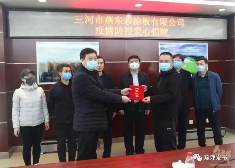1月31日下午,愛心企業燕東彩涂板有限公司向我區捐資50000元,助力全區新型冠狀病毒感染的肺炎疫情防控工作。燕郊高新區將把捐贈資金全部用于一線疫情防控工作,真正把愛心傳遞給奮戰在防疫一線的同志們,以高度的責任感和使命感,助力打贏疫情防控阻擊戰!