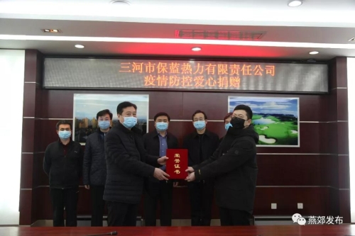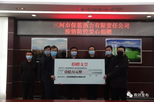 新型冠狀病毒感染的肺炎疫情發生以來,防控工作受到大家廣泛關注。許多愛心人士、愛心企業和愛心組織紛紛獻出愛心助力抗擊疫情。2月7日,保藍熱力有限公司向燕郊高新區捐贈10萬元,助力我區疫情防控工作。