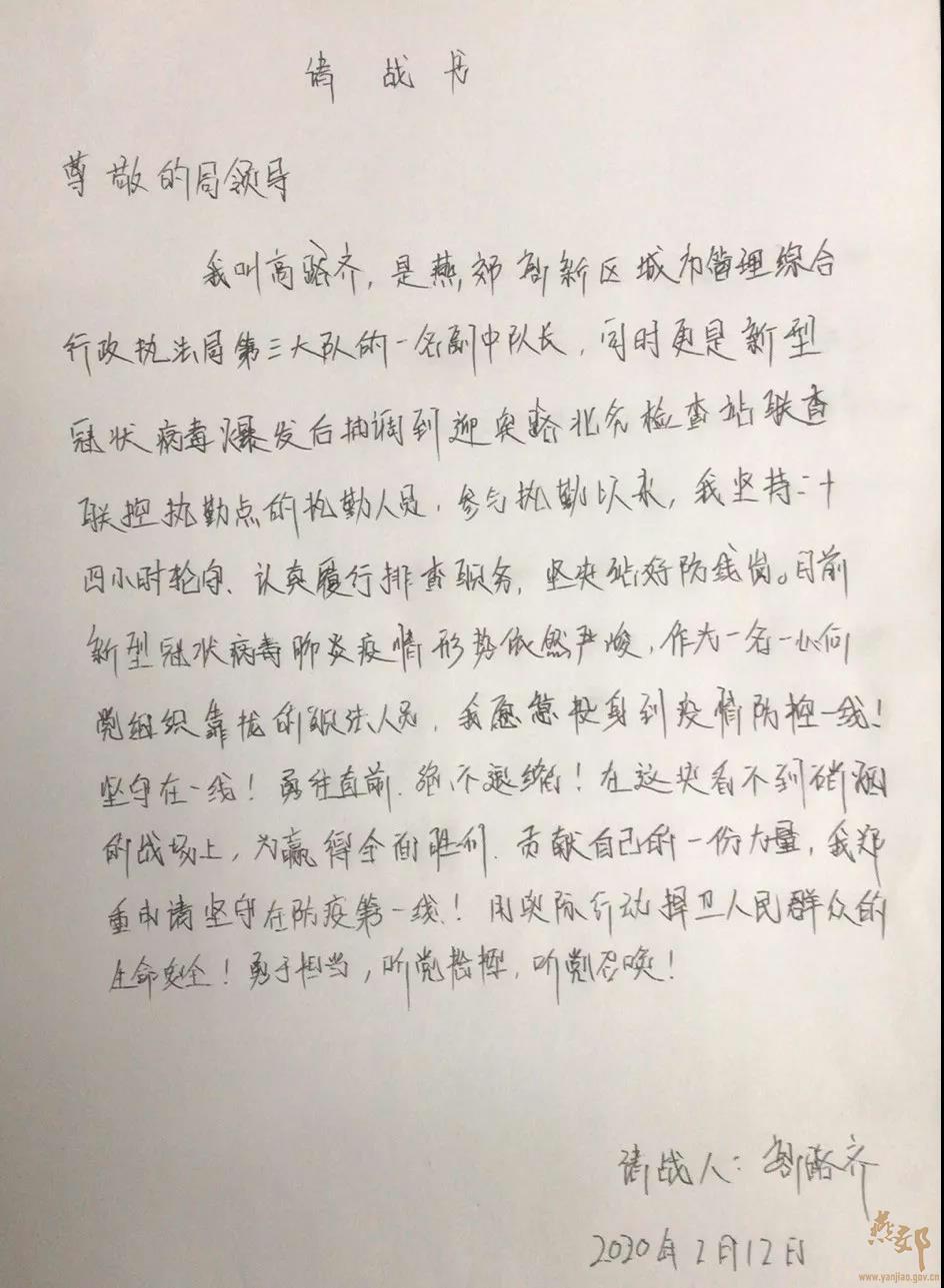 自新型冠狀病毒引起的肺炎疫情發生以來,孫曉桐、鄧超、高路齊、張國超、李鵬飛、劉慶、董秋陽、王小領火速遞交了請戰書和入黨申請書,自愿請戰到防疫一線。他們是燕郊高新區綜合行政執法局的一員,更是執法局全體干部職工的縮影,在這場沒有硝煙的戰斗中,他們堅守崗位,盡心盡力,筑成一道疫情防控的堅實堡壘,默默守護著這個城市。