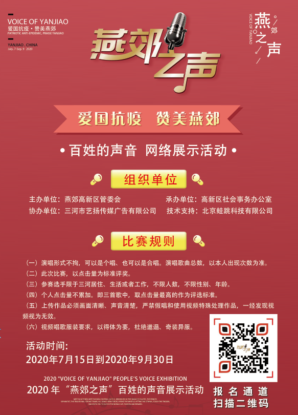 本次活動(dòng)以網(wǎng)絡(luò)評(píng)比的方式進(jìn)行。參賽選手不限性別、年齡,只要在三河居住、生活或者工作,均可報(bào)名。演唱內(nèi)容突出愛(ài)國(guó)抗疫為主,贊美燕郊,歌頌傳統(tǒng)文化為輔,內(nèi)容積極向上,提倡原創(chuàng)?;顒?dòng)設(shè)置冠軍一名、亞軍一名、季軍一名,最佳人氣獎(jiǎng)200名。以點(diǎn)擊量為評(píng)判標(biāo)準(zhǔn),想要報(bào)名的選手可通過(guò)掃描圖片二維碼參加。報(bào)名時(shí)間截止到8月10日,具體演唱要求也可通過(guò)掃描二維碼了解。