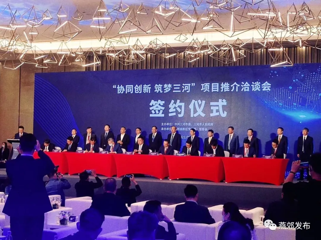 5月8日,三河市2021年 “協同創新·筑夢三河”項目推介洽談會在通州區舉辦,推進會上燕郊高新區成功簽約項目70個,總投資1200多億元,其中百億元以上項目4個,10億元以上項目5個,簽約項目數量占全市總量的82%,項目數量和投資規模為近年來最高。簽約項目涉及城市更新、康老醫療、科創基地、裝備制造等領域,具有良好的發展前景。