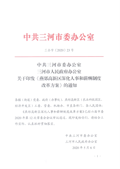 中共三河市委辦公室三河市人民政府辦公室關于印發《燕郊高新區深化人事和薪酬制度改革方案》的通知