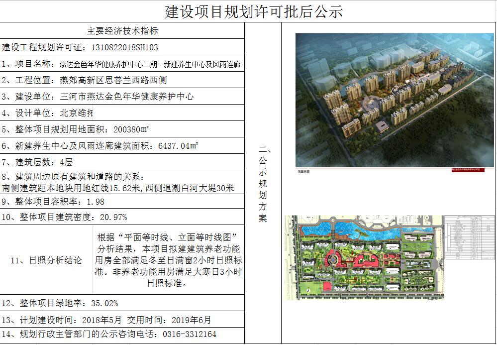 三河市燕達金色年華健康養護中心申請的燕達金色年華健康養護中心二期--新建養生中心及風雨連廊項目規劃許可批后公示《建設工程規劃許可證》已于2018年5月14日核發,現依據河北省住建廳《關于進一步加強城鄉規劃公示公布工作的指導意見》(冀建規【2011】397號),對此項目予以公布。