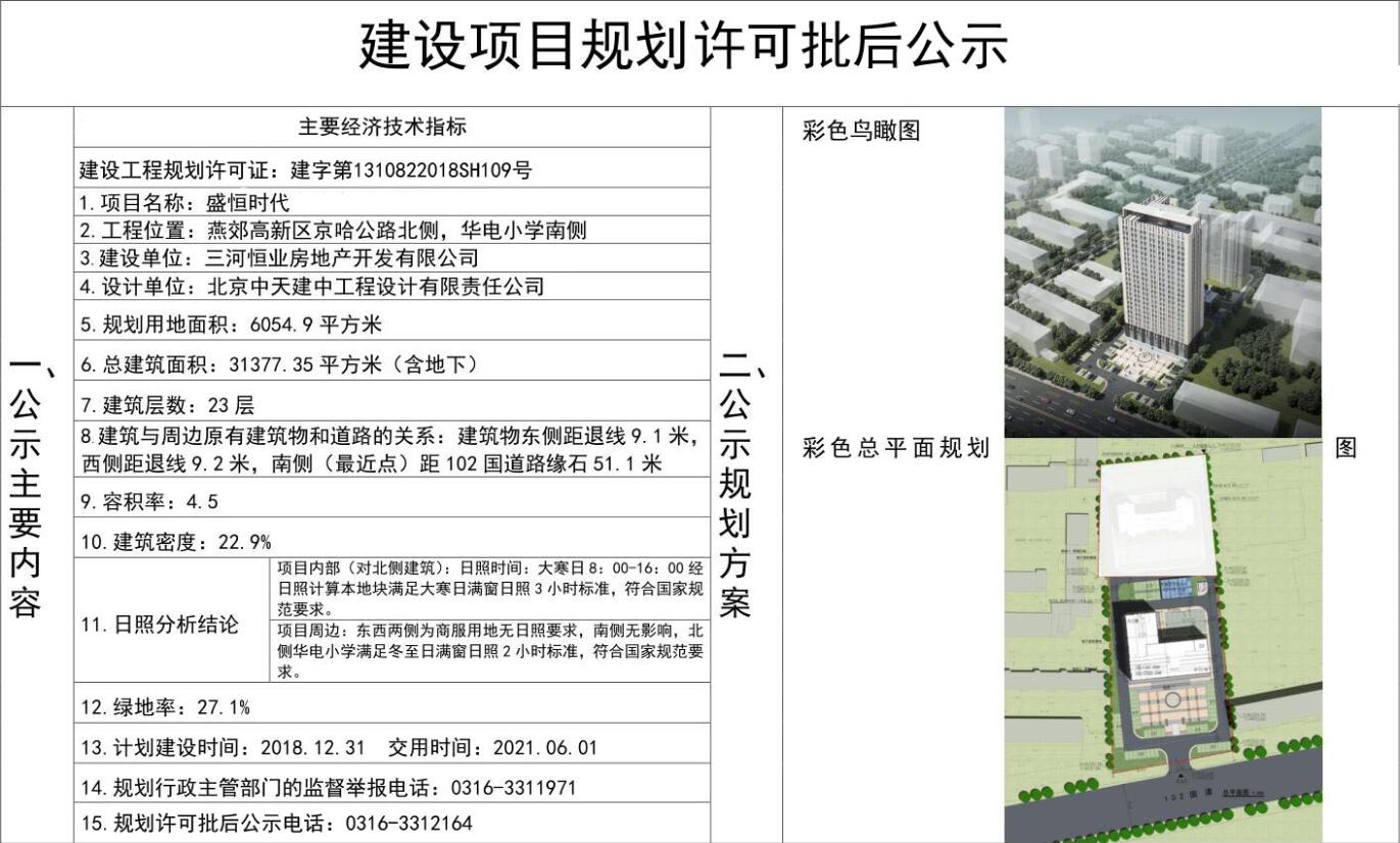 三河恒業房地產開發有限公司申請的盛恒時代項目《建設工程規劃許可證》于2018年10月24日核發,現依據河北省住建廳《關于進一步加強城鄉規劃公示公布工作的指導意見》(冀建規【2011】397號),對此項目予以公布。