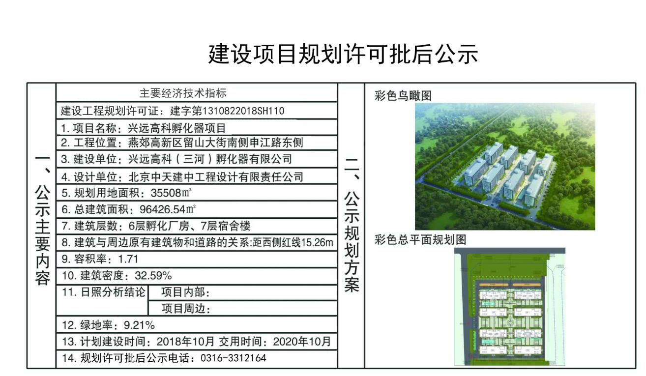 興遠(yuǎn)高科(三河)孵化器有限公司申請(qǐng)的興遠(yuǎn)高科孵化器建設(shè)項(xiàng)目《建設(shè)工程規(guī)劃許可證》于2018年11月29日核發(fā),現(xiàn)依據(jù)河北省住建廳《關(guān)于進(jìn)一步加強(qiáng)城鄉(xiāng)規(guī)劃公示公布工作的指導(dǎo)意見》(冀建規(guī)【2011】397號(hào)),對(duì)此項(xiàng)目予以公布。