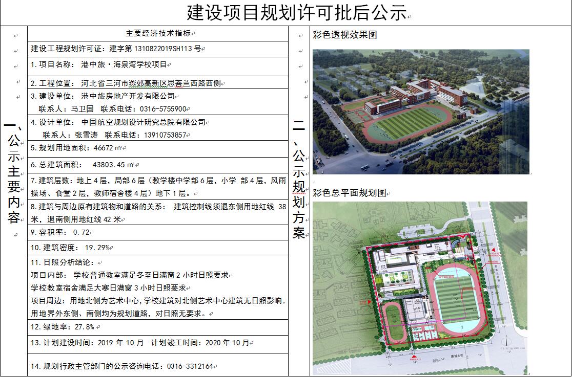 港中旅房地產(chǎn)開發(fā)有限公司申請的港中旅·海泉灣學(xué)校項目《建設(shè)工程規(guī)劃許可證》于2019年8月19日核發(fā),現(xiàn)依據(jù)河北省住建廳《關(guān)于進一步加強城鄉(xiāng)規(guī)劃公示公布工作的指導(dǎo)意見》(冀建規(guī)【2011】397號),對此項目予以公布。