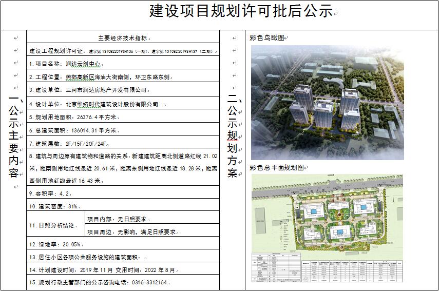 三河市潤達房地產開發有限公司申請的潤達云創中心項目一期工程《建設工程規劃許可證》于2019年11月22日核發,潤達云創中心項目二期工程《建設工程規劃許可證》于2019年11月28日核發,現依據河北省住建廳《關于進一步加強城鄉規劃公示公布工作的指導意見》(冀建規【2011】397號),對此項目予以公布。