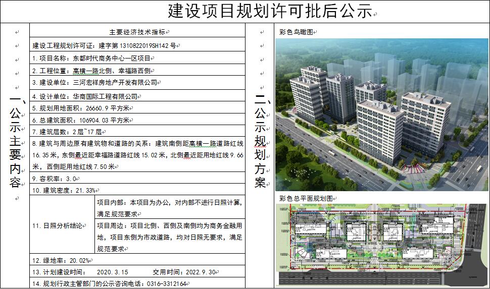 三河宏祥房地產開發有限公司申請的東都時代商務中心一區項目《建設工程規劃許可證》于2019年12月26日核發,現依據河北省住建廳《關于進一步加強城鄉規劃公示公布工作的指導意見》(冀建規【2011】397號),對此項目予以公布。