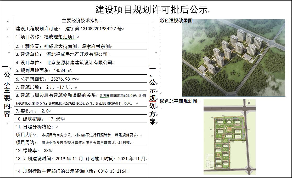 河北福成房地產開發有限公司申請的福成理想匯項目《建設工程規劃許可證》于2019年10月22日核發,現依據河北省住建廳《關于進一步加強城鄉規劃公示公布工作的指導意見》(冀建規【2011】397號),對此項目予以公布。